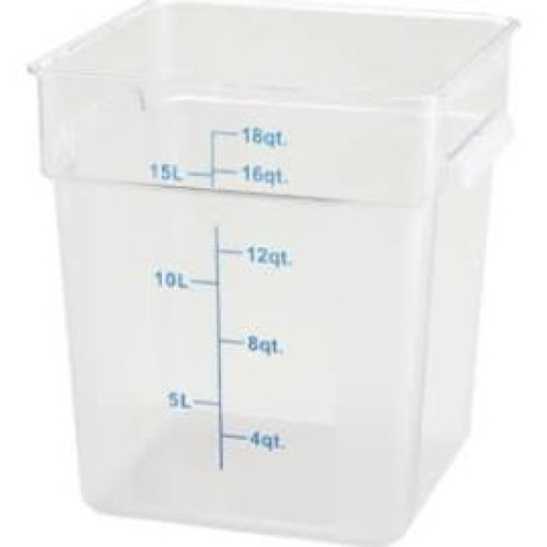 Keep your fruits, vegetables, sauces, spices, dry ingredients, wet ingredients, and so much more, fresh, while maintaining proper portions with 18 qt. clear square graduated food storage container! Made of crystal-clear, break-resistant poly-carbonate, this container offers fast, reliable portion control with both colored measurements that are printed directly onto its exterior surface, and graduations. Its square design maximizes storage space when compared to a round container.
