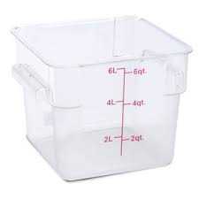 Keep your fruits, vegetables, sauces, spices, dry ingredients, wet ingredients, and so much more, fresh, while maintaining proper portions with 6 qt. clear square graduated food storage container! Made of crystal-clear, break-resistant poly-carbonate, this container offers fast, reliable portion control with both colored measurements that are printed directly onto its exterior surface, and graduations. Its square design maximizes storage space when compared to a round container.
